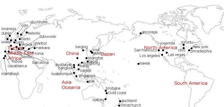 | 1973年、会社からの出張で初めてアメリカ カナダを一か月旅して以来 尋ねた海外の 主な都市です。その後 南米やロシアなどを除いた各地を訪ね 海外旅行ももう57回を 数えます。まだまだ見知らぬ景色や文化を訪ねて 元気なうちに行って みたい所が沢山残っています。最高に気に入った国はイギリスですが その他 にも トルコ、クロアチア、チェコ、台湾、などが私のお気に入りです。 |