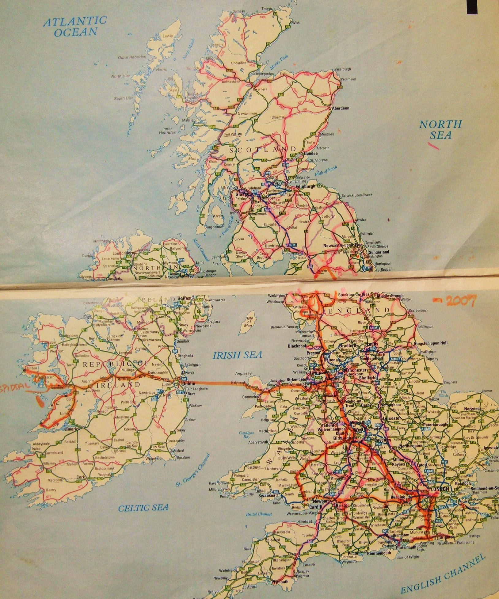 | 1999年、初めて英国を家族ドライブして以来 これまでに走ったイギリスの道路。 オレンジとピンクでなぞった道路全てを走りました。毎年のPOTFEST参加の為 毎年3〜4週間、田舎の割安レンタカーを借り POTFEST終了後 陶芸家の友人たちを 訪ねて イングランドの南の端からスコットランドの北の方まで毎年3000Kmくらい 走ります。イギリスの交通システムは日本と同じですから 運転は随分楽です。 ただ2004年に一度だけ ドーバーを渡ってアムステルダムからドイツ国境まで オランダを走破した時は 道路システムがイギリスと反対になり安全運転に随分 気を使いました。 |