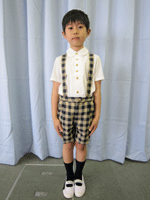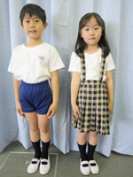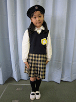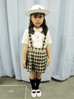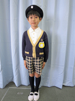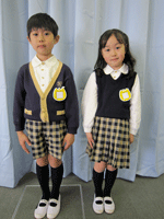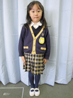 長袖ブラウス(金のボタンと刺繍)、チェックのズボン・スカート、カーディガン、制ハイソックス ベストはオプションです。紺の無地ならば市販のものでもけっこうです。制ハイソックス(紺M刺繍入り)は行事の時に着用。日常は短いソックス(紺または白)でもけっこうです。上靴は基本色が白であればつま先がカラーになっていてもけっこうです。通園の靴は運動靴(自由)で、雨の日は長靴(自由)です。 |