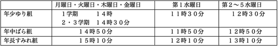 2)利用の終了時間は 年齢による体力などの違いを考慮し時差を設ける。また、水曜日は職員会議と行事準備のため半日保育とするため、以下の表のとおりとする。