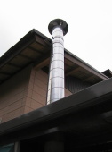 窯の煙突位置に合せて天井に穴を開ける | 先端の支持金具は家本体に固定 | ステンレス製の外部煙突を付けて完成 |