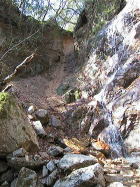 狭い谷に自然の砂防堰堤? ぽっこりと大きな岩がはまっている |