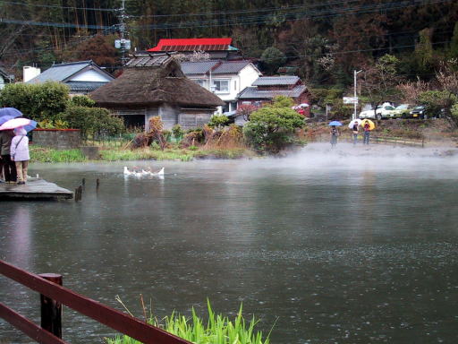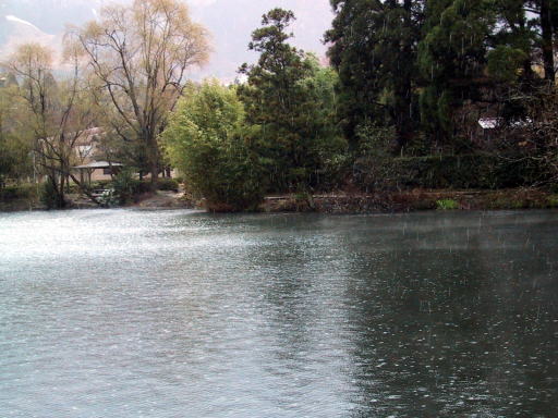 みぞれのような雨が降り出し、金鱗湖の朝は霧に包まれ
