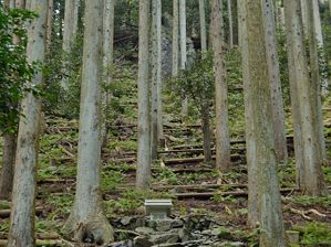 二本松尾根登山道を歩き、適当に右へ離れて林道を横断する。三重県のコンクリ杭あたりからシダが繁茂する植林へ入る。右前方に登山者が見えたのが気になり、行くと井戸谷登山道だった。ついでにイワクラ遙拝所へ立ち寄る。背の高い夏草が無くなり登山道から入りやすくなったが荒れたままだ。