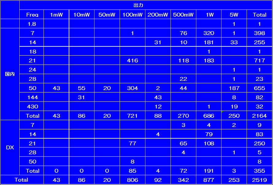 Call Sign Date Time His My Freq. Mode Power JI7WTK 26-Apr-92 09:22J 59 59 14 SSB 0.5W JA8IYX/8 26-Apr-92 16:54J 59 59 14 SSB 0.5W JR8AKR 28-Apr-92 08:03J 59 58 14 SSB 0.5W JA6BE 29-Apr-92 11:21J 59 56 14 SSB 0.5W JA4RL/4 29-Apr-92 11:38J 59 59 14 SSB 0.5W JA7UHV 29-Apr-92 12:07J 59 59 14 SSB 0.5W JA8LKU 29-Apr-92 14:33J 59 54 14 SSB 0.5W JA6GVF 30-Apr-92 16:34J 59 57 14 SSB 0.5W JA6BYE 02-May-92 09:21J 59 59 14 SSB 0.5W JR8MGB/8 09-May-92 16:20J 59 59 14 SSB 1W JR2BJE/1 09-May-92 16:28J 59 59 14 SSB 1W JL1SVR 09-May-92 16:41J 59 59 14 SSB 1W JA0NQD/1 09-May-92 16:49J 59 57 14 SSB 1W JH8KCI 10-May-92 09:29J 59 59 14 SSB 1W JA6BE 16-May-92 19:15J 59 56 14 SSB 1W JA0PE 17-May-92 17:49J 59 59 14 SSB 1W JI8EYP 30-May-92 09:14J 55 52 14 SSB 1W JA2PJX/2 07-Jun-92 09:48J 59 59 14 SSB 1W JA1AHU 13-Jun-92 18:23J 59 58 14 SSB 1W JA8ABZ 14-Jun-92 08:16J 59 59 14 SSB 1W JA7BZC 14-Jun-92 08:25J 59 55 14 SSB 0.2W K6UMB 14-Jun-92 23:39J 59 57 14 SSB 1W JA6HW 21-Jun-92 09:58J 59 57 14 SSB 1W JA7IL 21-Jun-92 11:53J 59 59 14 SSB 1W K6UMB 22-Jun-92 15:35J 59 33 14 SSB 0.2W JA6YG 22-Jun-92 19:14J 59 59 14 SSB 0.2W JA8AXL 27-Jun-92 18:12J 59 55 14 SSB 0.2W 7K1LUE/3 05-Jul-92 14:06J 59 54 14 SSB 0.2W JA6AV 05-Jul-92 14:37J 59 57 14 SSB 0.2W JE6CAJ 11-Jul-92 10:31J 59 59 14 SSB 0.2W JA7AB 12-Jul-92 14:33J 59 59 14 SSB 0.2W JA1NOX 12-Jul-92 14:40J 59 55 14 SSB 0.2W JA4HJJ 12-Jul-92 16:49J 59 54 14 SSB 0.2W JH6FTJ 12-Jul-92 17:10J 59 53 14 SSB 0.2W JR6BTH 18-Jul-92 12:16J 59 55 14 SSB 0.2W JA4WHO 18-Jul-92 13:24J 59 51 14 SSB 0.2W JA1XCZ/4 18-Jul-92 13:52J 59 57 14 SSB 0.2W JA1VAA/1 18-Jul-92 15:16J 59 55 14 SSB 0.2W JA3GLU 18-Jul-92 16:50J 59 52 14 SSB 0.2W JR5XJV 18-Jul-92 16:53J 59 55 14 SSB 0.2W JA6MID 18-Jul-92 17:08J 59 58 14 SSB 0.2W 8J7SEA 09-Aug-92 10:55J 59 57 14 SSB 0.2W JA7GGU 09-Aug-92 11:33J 59 55 14 SSB 0.2W 8J8ISY 10-Aug-92 11:59J 59 53 14 SSB 0.2W JR7CRU 10-Aug-92 13:21J 59 52 14 SSB 0.2W JR6TJP 12-Sep-92 11:07J 59 53 14 SSB 0.2W V63HN 13-Sep-92 15:13J 59 59 14 SSB 0.2W JA7ETU 13-Sep-92 16:59J 59 59 14 SSB 0.2W JE8TZJ 20-Sep-92 17:25J 59 56 14 SSB 0.2W JE8TZJ 26-Sep-92 15:52J 59 59 14 SSB 0.2W HL2BM 11-Oct-92 17:20J 59 55 14 SSB 0.2W KC6DX 25-Oct-92 17:56J 59 59 14 SSB 0.2W JA6BEE 31-Oct-92 11:41J 59 58 14 SSB 0.2W JG1GQX 31-Oct-92 12:17J 59 55 14 SSB 0.2W JR8MSS 31-Oct-92 16:12J 59 53 14 SSB 0.2W JR8XWU 07-Nov-92 14:35J 59 55 14 SSB 0.2W 7K1MZA/6 08-Nov-92 15:09J 59 43 14 SSB 0.2W JA8PMN 08-Nov-92 15:24J 59 53 14 SSB 0.2W JA8TR 15-Nov-92 12:21J 59 45 14 SSB 0.2W AB6MY/MM 02-Dec-92 11:36J 59 55 14 SSB 1W JH6PYZ 09-Jan-93 13:23J 59 57 14 SSB 1W JA8BBD 17-Jan-93 08:53J 57 43 14 SSB 1W XU7VK 06-Feb-93 18:22J 59 59 14 SSB 1W JL6IKM 14-Feb-93 11:58J 59 59 14 SSB 1W JA8XOK 14-Feb-93 12:20J 59 59 14 SSB 1W JH8DWT 20-Feb-93 16:32J 59 59 14 SSB 1W N6NF 07-Mar-93 14:58J 59 59 14 SSB 1W JA6YUM 14-Mar-93 15:34J 59 59 14 SSB 1W 5Z4BI 27-Mar-93 07:21J 59 59 14 SSB 1W K7RI 27-Mar-93 15:15J 59 59 14 SSB 1W JG7LHN 10-Apr-93 11:36J 59 59 14 SSB 1W JE1DGW 16-May-93 17:31J 59 56 14 SSB 1W JG1QYM 23-May-93 14:12J 59 59 14 SSB 1W JA1XJF 23-May-93 14:54J 59 59 14 SSB 1W JF1AFM 19-Jun-93 13:26J 59 57 14 SSB 1W 7N2RWX 19-Jun-93 13:36J 59 59 14 SSB 1W JG1QJY 19-Jun-93 13:42J 59 57 14 SSB 1W JH1LRO 19-Jun-93 13:52J 59 57 14 SSB 1W JF2GYH 19-Jun-93 14:01J 59 57 14 SSB 1W 9M8ZZ 03-Jul-93 23:33J 56 59 14 SSB 1W JA7IZO 01-Aug-93 17:20J 59 59 14 SSB 1W JA2FG/1 07-Aug-93 10:26J 59 59 14 SSB 1W JL1XWR 07-Aug-93 10:32J 59 59 14 SSB 1W JA3JYX/1 14-Aug-93 09:05J 59 57 14 SSB 1W 8J0JES/0 15-Aug-93 13:57J 59 57 14 SSB 1W JA7CHL/1 15-Aug-93 14:03J 59 55 14 SSB 1W JA3OXC 15-Aug-93 14:07J 59 56 14 SSB 1W JA3QFO/3 15-Aug-93 14:24J 59 57 14 SSB 1W JA1XJF 15-Aug-93 14:52J 59 57 14 SSB 1W VK3EW 04-Sep-93 15:29J 59 59 14 SSB 1W W7RM 05-Sep-93 14:15J 59 59 14 SSB 1W JA8ARY 16-Jan-94 15:31J 59 59 14 SSB 1W JR1CVU 28-May-95 09:18J 59 53 14 SSB 1W JA0YI 04-Jun-95 16:15J 59 59 14 SSB 1W JA8WGG 14-Oct-95 13:05J 59 53 14 SSB 1W JR8EAB 14-Oct-95 13:23J 59 59 14 SSB 1W JO2RBH/3 02-May-96 09:49J 59 58 50 SSB 0.05W JM2NKQ/2 02-May-96 15:48J 59 51 50 SSB 0.1W JF2ICB/2 03-May-96 18:13J 59 53 50 SSB 0.3W JF2WXS/2 03-May-96 18:32J 59 51 50 SSB 0.3W JJ2FVD/2 04-May-96 18:53J 59 51 50 SSB 0.5W JS1HQJ/2 05-May-96 08:58J 59 59 50 SSB 0.5W JS3UAB/3 05-May-96 11:48J 59 55 50 SSB 0.5W JG2CSX/2 05-May-96 13:12J 59 55 50 SSB 0.5W JH3FYC/3 06-May-96 18:01J 59 51 50 SSB 0.5W JA4FVC 19-May-96 10:26J 59 55 14 SSB 1W JA3BXC/3 25-May-96 09:11J 59 53 50 SSB 0.5W JE2IMX/2 26-May-96 08:26J 59 53 50 SSB 0.5W JH4PBM 26-May-96 08:44J 59 59 14 SSB 1W JD1BJP 26-May-96 09:30J 59 51 50 SSB 0.5W JE2DCA/0 01-Jun-96 09:45J 59 55 50 SSB 0.5W JO2XSB/2 01-Jun-96 17:04J 59 55 50 SSB 0.5W JN3NFQ/3 08-Jun-96 18:00J 59 53 50 SSB 0.5W JI2XIU/2 08-Jun-96 18:04J 59 59 50 SSB 0.5W JA6ERE 22-Jun-96 09:31J 59 55 14 SSB 1W JA4DW 22-Jun-96 10:17J 59 59 14 SSB 1W JA7IG 22-Jun-96 13:38J 59 59 14 SSB 1W JA8ACN 22-Jun-96 13:51J 59 55 14 SSB 1W JK2MAG/2 23-Jun-96 09:53J 59 59 50 SSB 0.5W JE7GWN/7 23-Jun-96 10:04J 59 59 50 SSB 0.5W JA7AHK 23-Jun-96 10:15J 59 57 50 SSB 0.5W JF7XFU 23-Jun-96 10:47J 59 54 50 SSB 0.5W JR8PPM 23-Jun-96 10:52J 59 59 50 SSB 0.5W JA7QPB 23-Jun-96 10:54J 59 55 50 SSB 0.5W JE8CIC 23-Jun-96 11:00J 59 59 50 SSB 0.5W JA7DTG/7 23-Jun-96 11:07J 59 59 50 SSB 0.5W JA8RAT/8 23-Jun-96 11:19J 59 59 50 SSB 0.5W JH8RDQ 23-Jun-96 11:20J 59 59 50 SSB 0.5W JE8LIM 23-Jun-96 11:28J 59 53 50 SSB 0.5W JH2KWO/2 23-Jun-96 16:05J 59 51 50 SSB 0.5W JA2WCC/2 23-Jun-96 16:19J 59 53 50 SSB 0.5W JF8EQE 29-Jun-96 16:48J 59 53 50 SSB 0.5W JI1NZL 29-Jun-96 18:02J 58 59 14 SSB 1W JR6TJP 21-Jul-96 16:26J 59 52 14 SSB 1W JA8THD 28-Jul-96 09:52J 59 59 50 SSB 0.5W JJ2QJZ/2 28-Jul-96 10:01J 59 59 50 SSB 0.5W JG2SZI/2 04-Aug-96 06:34J 59 59 50 SSB 0.5W JH2VLO/2 04-Aug-96 06:37J 59 59 50 SSB 0.5W JR3KQJ/3 04-Aug-96 06:40J 59 59 50 SSB 0.5W JP2BQB/2 04-Aug-96 07:50J 59 59 50 SSB 0.5W JE2QEP/2 04-Aug-96 07:52J 59 59 50 SSB 0.5W JF2NCI/2 07-Aug-96 20:54J 59 52 50 SSB 0.5W JJ3JHP/3 17-Aug-96 17:20J 59 57 50 SSB 0.5W JA2MWV
