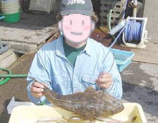 移動後、ポツポツとアタリます…が、ハゼばかり…(ーー;) 定置網の近くまで流されてきたので移動しようということになり、置き竿に手を伸ばそうとしたら、リールから糸が出ていってるじゃないですか…定置網のロープにでも引っ掛かったかな?と思いながら、「引っ掛かったみたいやわ…でも、巻けて来るよ」と言った次の瞬間! 「ゴンッ!ゴンッ!ゴンッ!」と引くじゃないですか!! 「魚やわっ!」「kikuchan!でかいよっ!慎重にっ!」と、かとちゃん。水面に上がってきた魚を見て「でかいっ!」と叫んじゃいました(^_^;) ボートに寄せて、タモですくってもらって取りこんだのはマゴチでした。