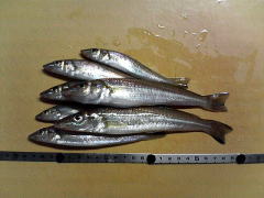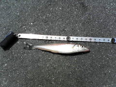 2投目で同じ位のを釣り上げ、3投目。「パッチーーン」といい音がして力糸から先が飛んでいきました(T_T) こんなときに限って、予備の力糸を持ってきていませんでした(T_T) そこで、有り合わせの糸で力糸…というより、リーダーを付けて、錘も軽い目にして、軽ぅく投げて何投目かな? リールを巻くのですが、何か重いんです。上のほうの針には小さなキスがかかってるのが見えました。下針に…誰かが捨てた糸でしょうか?糸が引っ掛かってます。「糸なんか捨てるんじゃないよ(ーー;)」と思いながら、「コレを捨てたら、釣師じゃないよね。回収して、きちんと捨てるべき場所に捨てよう」と思って引き上げたら、なんと、さっき飛んで行ったkikuchanの「力糸と仕掛け with 海星★」じゃないですか! 何年か、釣りをしてますが、「自分の仕掛け」を釣ったのは、初めてです(^o^;) いそいそと、糸を結びなおしたのは、言うまでもありません♪ その後、20cm近いのも含めて、合計7匹(3匹リリース)釣ったところで、日が陰ってポツリと1滴来たので納竿しました。約2時間の釣行でした。