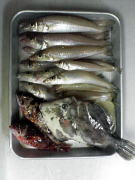 9時頃にキス釣りに。今回の釣行は、何故かメゴチが多い(+_+) kikuchanは下手すると、メゴチの方が沢山釣れたのでは(^_^;) WADAchanもメゴチに悪戦苦闘してました。メゴチだけじゃなく船内では外道の嵐でした。キス、メゴチ、チャリコでしょ、オジサンにホウボウにアカイカ。エソにカワハギ、ガシ、アナゴ…オヤビッチャにハオコゼまで。途中に休憩兼ねて市場に行ったらコレがまた面白かったです♪ 大きなアジやタイ。捨てられてた小魚の中には見たことないような面白い魚もいました(^^) 写真撮って来ればよかったなぁ。結局昼過ぎまで頑張って、キスも全員で50〜60匹釣れました。とても楽しい釣行でした(^^)v