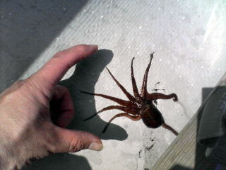 早速、仕掛けを準備して、今日の一発目!! クン、クンッというアタリがすぐに!! 幸先良く、15pクラスをゲット♪ このあとも、8時頃までは、結構いいペースで10匹くらいを釣り上げました。中には20pクラスも(^^)v 9時過ぎからは、少しペースが落ちてきて、移動に費やす時間が増えてきたので、10時頃からはアンカーを打って、半ば居眠り状態でポツリポツリと… 11時頃からまたボートを流しながら釣ってました。 ぼちぼち、帰ることを考えて、あまり沖まで出ずに流してたら、タコが釣れました。メッチャ可愛いタコです。
