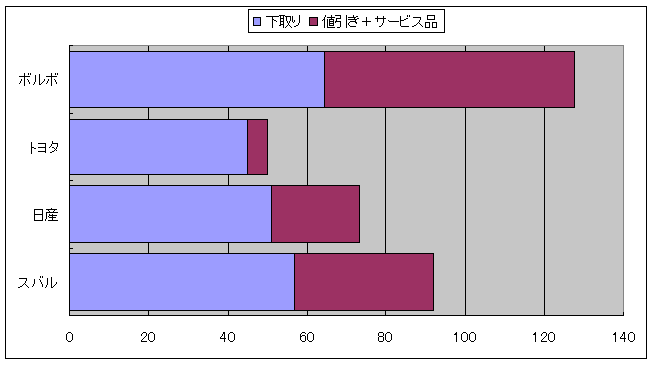 各社の本体値引き+サービス品と下取り査定の最終段階での金額をグラフにしてみました。