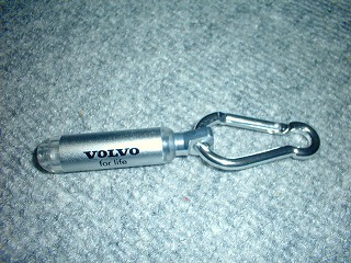 初めて通るETCゲートはちゃんと認識してくれるかドキドキですね。やはりバーの手前で反射的にブレーキを踏んでしまいます。ちゃんとETCは認識してスッとバーが上がってノンストップで料金所を通過。カーナビもETCと連動して認識。画面でETCレーンも表示してくれました。ETCってなんか高速を無料で通過したみたいでいいですね、これ。(笑) その後、ボルボ・カーズ四日市へ行き新しい800台限定の特別仕様車「V70 Black Sapphire Limited Edition」を見てきました。黒のメタリックはキレイなのですが、汚れや傷が目立ちそうな色だなぁ・・・と感じました。ホイールが17インチなのですが、17インチ用に足回りをセッティング変えているのか聞いてみたところ、特別そんなことはやっていないだろうとのことでした。17インチだとどんな感じになるんだろう?かなり路面のギャップでゴンゴン突き上げるんじゃないかなー?って思いました。来場記念に下写真のキーホルダーを頂きました。ひねるとライトが点灯します。