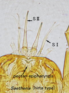 | Mandible with apical tooth only, inner tooth lacking. Seta subdentalis sharp. | ST: short needle shape. SU: very long and thick. Pecten epipharyngis 4 small lobes. Premandible divided into 3 . |