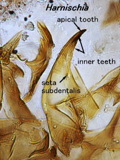 | Microchironomus | 中央歯は山型の3歯、 側歯の外側3歯に特徴 |