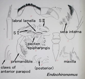 | 体長4.5〜5mm。淡橙色。前擬脚は大きく、頭と同じくらい。 | 中央歯は小さな4つに分かれ外側の歯は淡褐色、内側の歯は黒褐色。側歯は6対。副下唇板は細長く左右に伸び、中央で接する。 | 背歯は小さく、黄褐色。先端歯は大きく、側歯は3。 背面の縁は大きな膨らみになる。触角は5節。 |