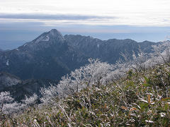 登るに従って背景が広がる ササにも霧氷がびっしり 雨乞岳で鈴鹿7mt完登のH君