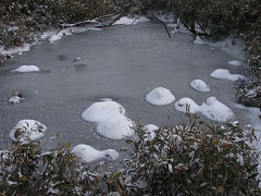 無人の山頂に着いた。これでH君はセブンマウンテン完登となった。静かだったのもつかの間、人が続々と登ってきて十数人になった。ヤブをかき分けて池を見に行く。やがて雪に埋もれるのだが、今は全面氷結だった。こういう姿は初めて見る。怖々片足を載せてみたらミシミシと音をたてた。靴を濡らすと大変なので、あわててひっこめる。誰も池を見に来ないが、知らないのだろうか。山頂で食事をしている人もいるが、こんな落ち着かない場所でやらなくてもねえ。