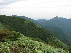 雨乞岳から下りてきた登山者とすれ違う。ようやく人に会った。食後の重い体を引きずって雨乞岳に登り着くと、さっきの人が丸坊主の東雨乞岳にポツンとたっている。なんだか絵になる。久しぶりに大峠の沢を見よう。すぐ近くだが激ヤブだ。人気がないのか知らないのか定かではないが、あまり通られていないようだ。今日も水はある。何故涸れないのか不思議だ。