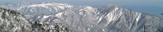 鋸岩の氷瀑は不作だった。規模も蒼さも物足りない。1パーティーがアイスクライミング中だった。氷が緩んでいるので登攀者がバイルやアイゼンを打ち込むたびにバラバラと氷のかけらが降ってくる。写真を撮ったりして休息。そのうち後のグループが追いついてきて混雑してきたので、左の岩尾根(奥尾根)に避難する。この尾根の上は絶景である。霊仙御池から竜、釈迦まで雪化粧した鈴鹿中北部の山並みが一望できる。冬は格別だ。国見峠越しにイブネの巨体も間近に見える。ここで昼食にするのも悪くないが、まだ時計が早い。