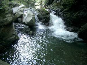 次の目標を青淵にしてどんどん歩く。めぼしい滝やゴルジュもなく、長いだけの谷である。炭焼き道はコマギレで使い物にならない。ゴーロの中を如何に疲れずに歩くかという、ルートファインディングだけが仕事だ。飽きてきた頃、もしかして青淵?のような場所に着いた。どうも小規模で違うようだが、越えるのが困難なような場所だったので寝転んで待つ。