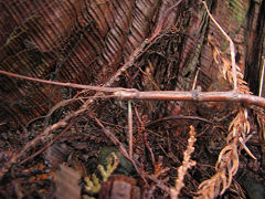 傾斜が緩んで600m等高線に囲まれた台地状の場所に着く。ブナはもうすぐだと思ったが、また進路に迷う。ヤブがうっとうしいので一旦南側の開けたところに出る。南部の山々が見えるが、山名はサッパリ分からない。やがてここも歩けなくなり、またフェンスを乗り越えると道らしきものがあった。尾根の北側の端を歩くのが正解のようだ。テープを辿り、道が高度を下げ始めた時に巨木が目に入った。葉や地面の実を確認、間違いなくブナである。標高は僅か620m足らず。周囲は植林でブナなど全くない。不思議なロケーションだ。この木はかなりの老木で、大きなウロができて、節穴から向こうが見えている。