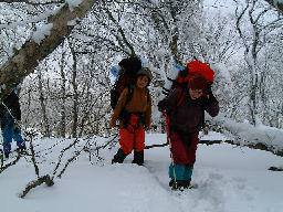 寝る前に樹氷鑑賞会を催す。カッパを着て吹雪の外に飛び出して、全員のヘッドランプを樹氷の木の下に集めてライトアップする。うひゃー、きれい。でも寒い。きれい寒い、きれい寒いで早々とテントに逃げ込む。