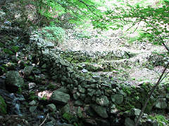 すっかりリフレッシュして、意気揚々と先へ進む。少し下っていくと左岸に石積みの棚田のような遺構があった。ワサビ田の残骸のようだ。このあとの谷下りは滝こそないものの明確な道はなく、決して楽なものではなかった。角ばった石の堆積で歩き難いのだ。出合までけっこう長く感じたが、ちょうどそこにクルマがあるという具合で救われた。