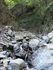 三連休の真ん中でオートキャンプ場は大賑わいだ。団地みたいにお隣さんとくっついて、設備の整った中でテント泊して面白いのだろうか。自宅の庭の方がまだマシだろう。普段はマンションやアパート暮らしの人達なのだろうか。その先のゲート脇に駐車して7時半ごろ出発。林道は少し落石があるだけで十分クルマでも通れる。しかしやがて巨大な岩が道を塞ぎ、道が崩落していた。納得して河原を歩きに切り替える。