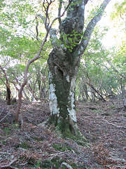 やがて目的地付近に着いたが、それらしきものは無い。そう簡単には問屋がおろさない。ザックをデポして周辺を探る。少し下りた水谷源頭斜面に太いブナを発見。これだなと思う。ちょっとクセのある形をしているうえに、急斜面で測りにくい。最初295cmと出て狂喜する。しかし測るたびに数値が違い、厳しくみて283cmを採用する。古武士を超えて見事鈴鹿第二位だ。このブナは北から見ると人のようにバスト、ウエスト、ヒップに分かれていて、太もも辺りで地面に埋まっている。腕にあたる両の枝が上に向かい、ちょうどバンザイをしている様に見える。名前はバンザイブナにしよう。地上1.3mの位置がバスト下部で、背中側も形が複雑なのでメジャーの廻し方で数値がコロコロ変わる。二人掛かり、あるいは虫ピンで止めながら測らないと正確ではない。