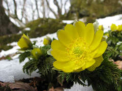 ゆっくりしてから、のろのろ斜面を下りてお花の尾根に向かった。平の口のフクジュソウが芳しくなかったので、あちらも見てみようと思った。こちらのほうが傷みは少ないようで何枚か写真を撮る。お花池の水は澄んでいた。白いものが沈んでいるので近づいてみると、それはカエルの腹だった。10匹ばかり死んでいる。やなものを見てしまった。