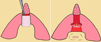 包皮粘膜を陰茎から剥離して(左図)、包皮と包皮粘膜を筒状のまま温存します(右図)。 |