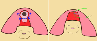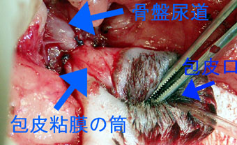 尿道と包皮粘膜を接合した部分が狭窄するのを防ぐため、尿道開口部は、左右に開いた状態で縫合固定します(右図)。