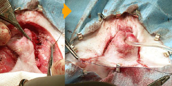 当院の手術方法は、1984年に術式を考案し最初の一例を手術して以来ずっと実施している方法で、1982年に山村らが報告した方法を改良したオリジナル術式です。多数の症例に対する手術実績とその後の長期間にわたる経過観察では、良好な治療成績が得られています。(第17回中部小動物臨床研究発表会、平成20年度日本小動物獣医学会(近畿)にて報告、JVM獣医畜産新報 2009年10月号に報告掲載)