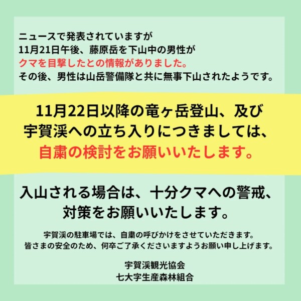宇賀渓観光協会は竜ヶ岳・宇賀渓への立入自粛を要請している。(宇賀渓観光協会)
