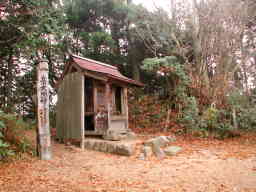 鳥居脇の石碑には「高森大神之行場」(開設明治43年)とある。奥には石碑がいくつかあり、「白砂大神」「一本杉六神」「不動明王」などが読みとれる。小滝があり、小川を対岸へ渡れば赤テープのある道が尾根を登っていた。