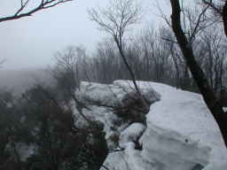 県境尾根の積雪は場所によって随分と違う。日当りの良いところは溶けているが、小さな雪庇が出来あがっているところもある。(写真1)進行方向が逆であるためか、アップダウンする尾根上では靴跡にピッチが合わない。ガスの中をイワクラ尾根の分岐点を目指して歩いた。