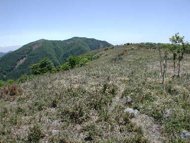 再び草原となる佐目峠、標識がなければ、それと気付かないような佐目峠の頭の最高点(樹下である)を通過。そして、杉峠への降りには公園のように木々が立ち並んでいた。青い空。そして、みずみずしい青葉。こんな所にとどまっていたいと願う。(写真6)右には綿向山。前方の雨乞岳が大きい。