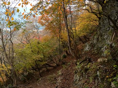 対岸へ渡り、目印を見ながら少し登れば、カマ跡から左後方へ斜面を登り拘留孫岳の東尾根に上がった。あとは雑木の尾根を我慢の急登が続く。散弾のプラスチック製の薬莢が落ちており、後方の遠くには犬の鳴き声がある。猟期が始まる。