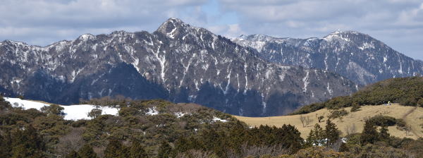 通報ポイント5標識が近づくと残雪が現れた。標識は積雪で傾いている。幸い、あまり踏み抜くこともなく残雪の斜面を登れた。谷上部に達すると吹き下ろす風が冷たいがペースは上がる。背後、V字型の谷から見る平野部には新名神高速道路の工事現場が見える。景観としては今ひとつになってしまった。雪崩の痕跡は見なかった。