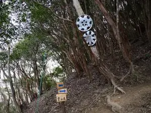 菰野富士駐車場の東側の橋を渡ると「ふれあいの森」の看板がある。看板の東側からジグザグに登れば、一回目に登った道に飛び出した。(地図の紫色ルート)