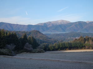 上石津地域事務所(旧役場)に自動車を置き、国道を南へ歩いて13分で朱色の公民館・前ヶ瀬コミュニティセンターに着く。ここから「養老高原スカイライン」に入った。集落を抜ければ田園の道。背後のソノド(宗ノ堂)は霜が降りたように白い。小さな墓地から急坂の舗装路となって、閉鎖ゲート(一般車両の通行禁止標識あり)で地道に変わる。アンテナ施設、植林帯を過ぎると明るい雑木林の道になった。林道としては幅員が広い。鉄塔23号では阿弥陀滝への林道(ゲートあり)が分岐する。